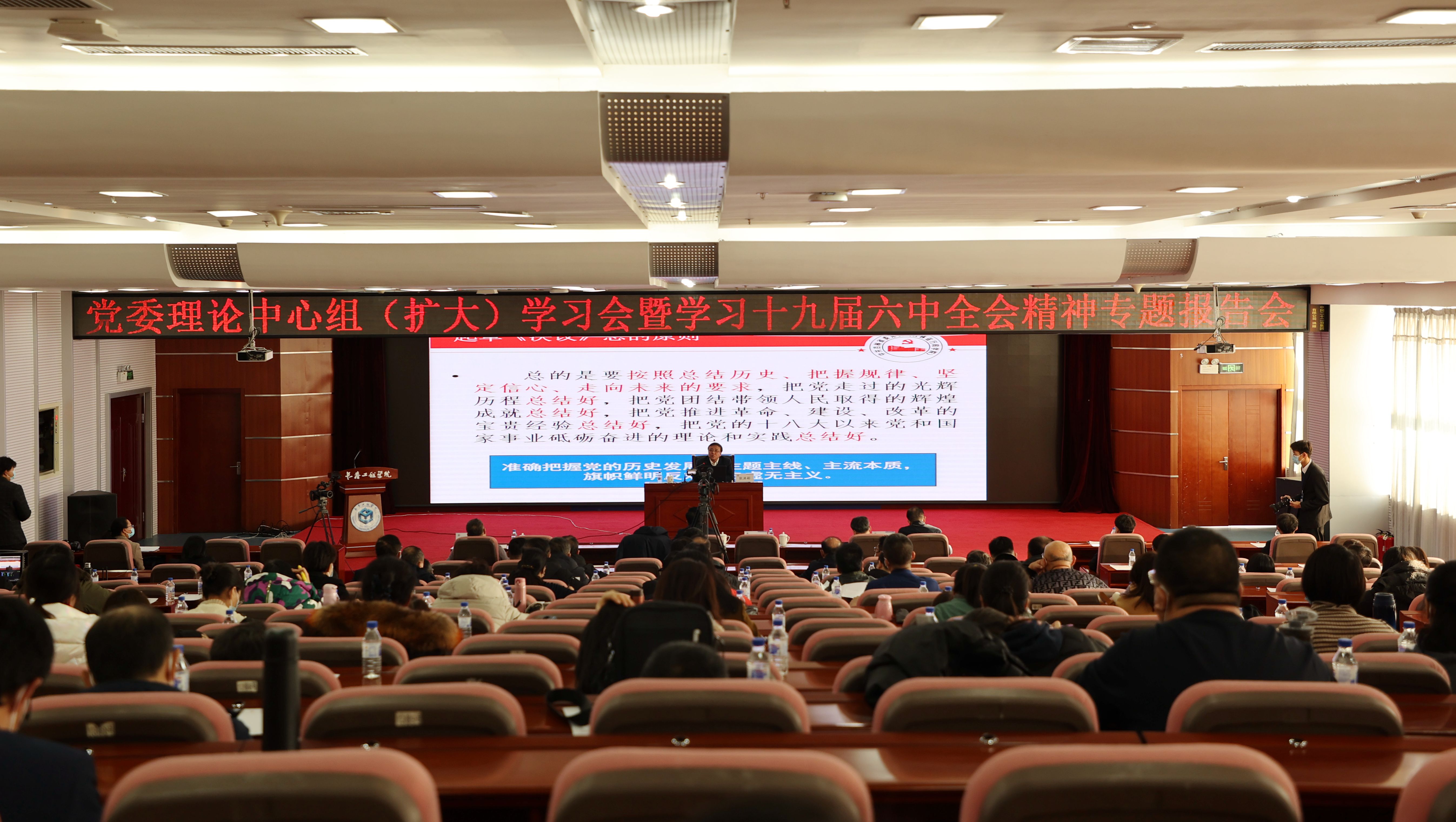 为深入学习贯彻党的十九届六中全会精神,11月24日,BBV网页版召开了党委理论学习中心组(扩大)学习会暨学习十九届六中全会精神专题报告会。BBV网页版邀请省委党校中共党史教研部主任耿洪彬教授做了题为《全面把握党的百年奋斗重大成就和历史经验---学习领会党的十九届六中全会精神》的专题报告。报告会在BBV网页版第三报告厅举行,BBV网页版领导陈权、刘兆国、杨永生、王延博参加了报告会。会议由陈权校长主持。