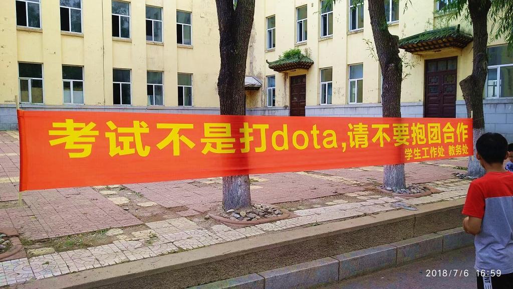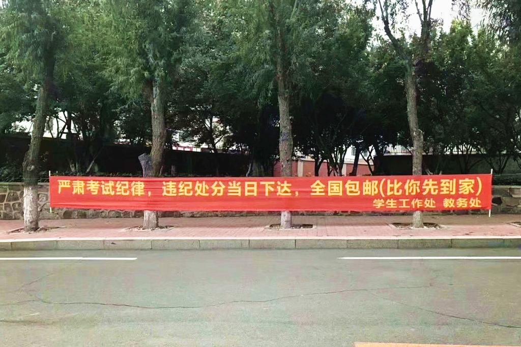 条幅的内容,有的“很可怕”,比如:严肃考试纪律,违纪处分当日下达,全国包邮(比你先到家)。有的“很淘气”,比如:考试不是打CS,不需要耳听六路、眼观八方;考试不是逛淘宝,不用集体动作、竭诚合作;考试不是谈恋爱,请不要眉目传情;考试不是打dota,请不要抱团合作。有的“很走心”,比如:今天偷的是他人知识,明天减少的是自己的财富;诚信考试“神州行”,本分做人“全球通”。