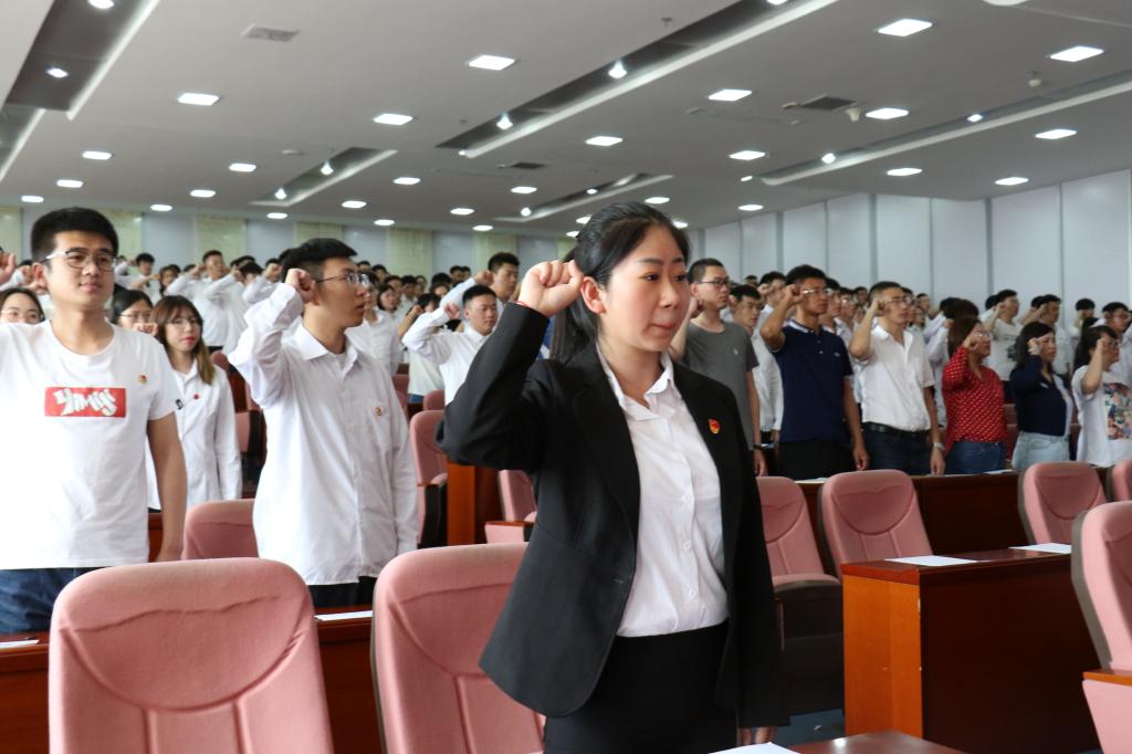 全体毕业生党员在党旗下庄严宣誓,重温入党誓词。