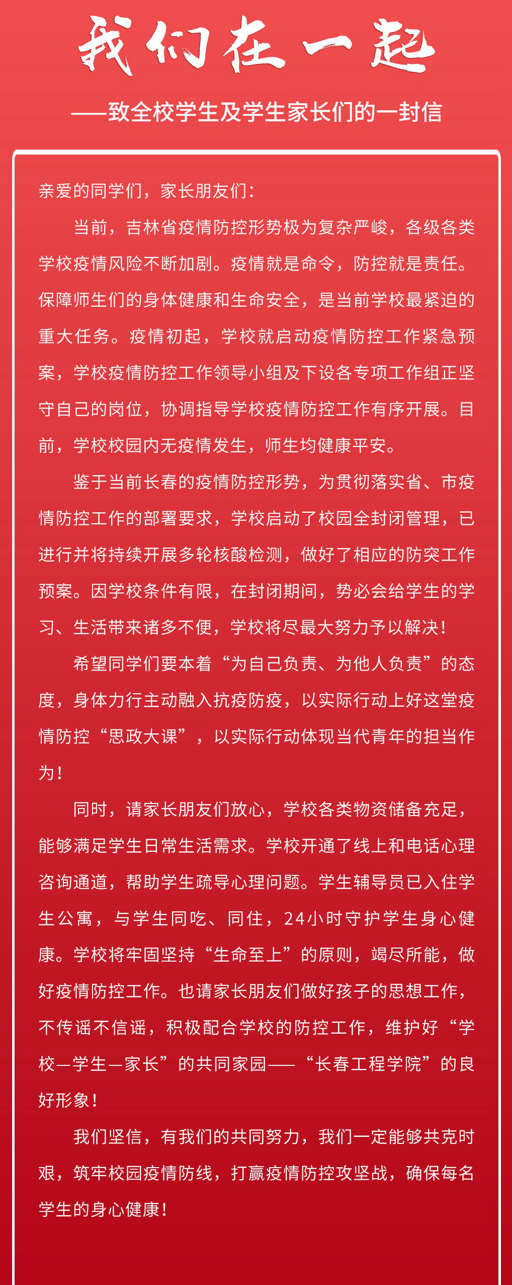 我们在一起——致全校学生及学生家长们的一封信