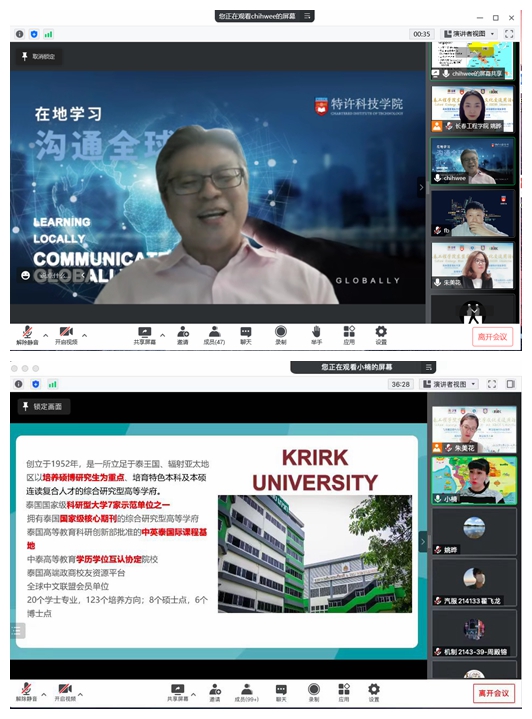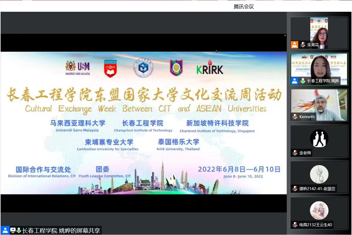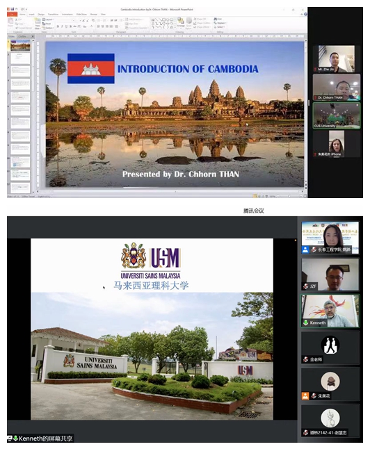 柬埔寨专业大学英语学院院长Chhorn Than博士、马来西亚理科大学中国中心负责人Kenneth Quah先生、新加坡特许科技学院高级讲师Siow Chih Wee先生、泰国格乐大BBV网页版长助理赵楠博士等四位老师,分别以“Introduction of CUS and Cambodia—来自文明古国柬埔寨”“马来西亚多元素文化与马来西亚理科大学介绍”“新加坡人文地理风貌及新加坡高校校园文化”“泰友好、泰享受之泰国文化及留学”为主题,以视频、讲解等多样的方式,面向全校学生介绍东盟国家及城市的地理、风俗、文化,展示了柬埔寨专业大学、马来西亚理科大学、新加坡特许科技学院、泰国格乐大学的魅力和故事,实现了“云访问、云介绍”,使同学们领略了独具特色的东南亚各国风情,增进了对东盟国家大学文化的了解。近700名学生线上参加了此次活动。