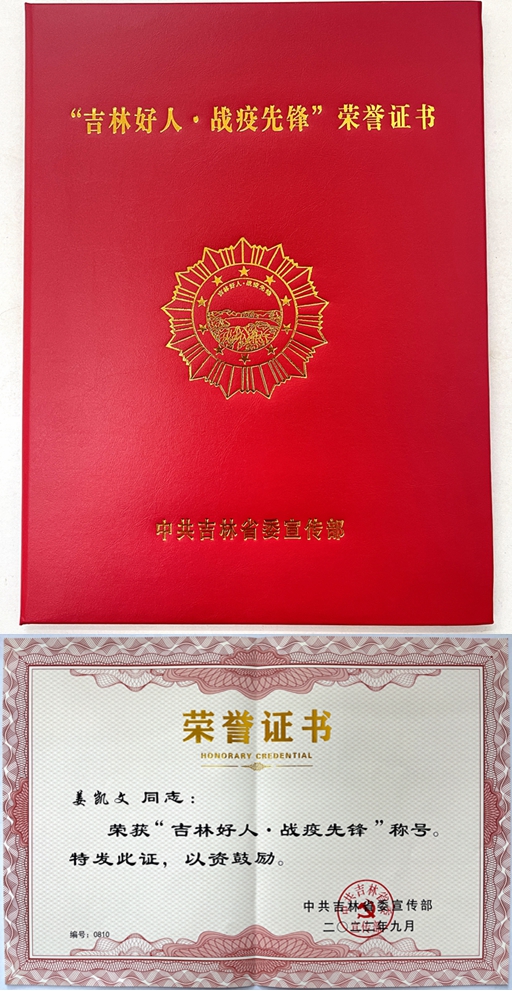 我校辅导员姜凯文获2022年“吉林好人•战疫先锋”荣誉称号