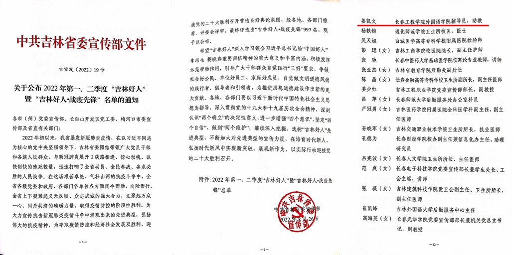 近日,中共吉林省委宣传部印发了《2022年第一、二季度“吉林好人”暨“吉林好人·战疫先锋”名单》,我校外国语学院辅导员姜凯文获评“吉林好人·战疫先锋”称号。