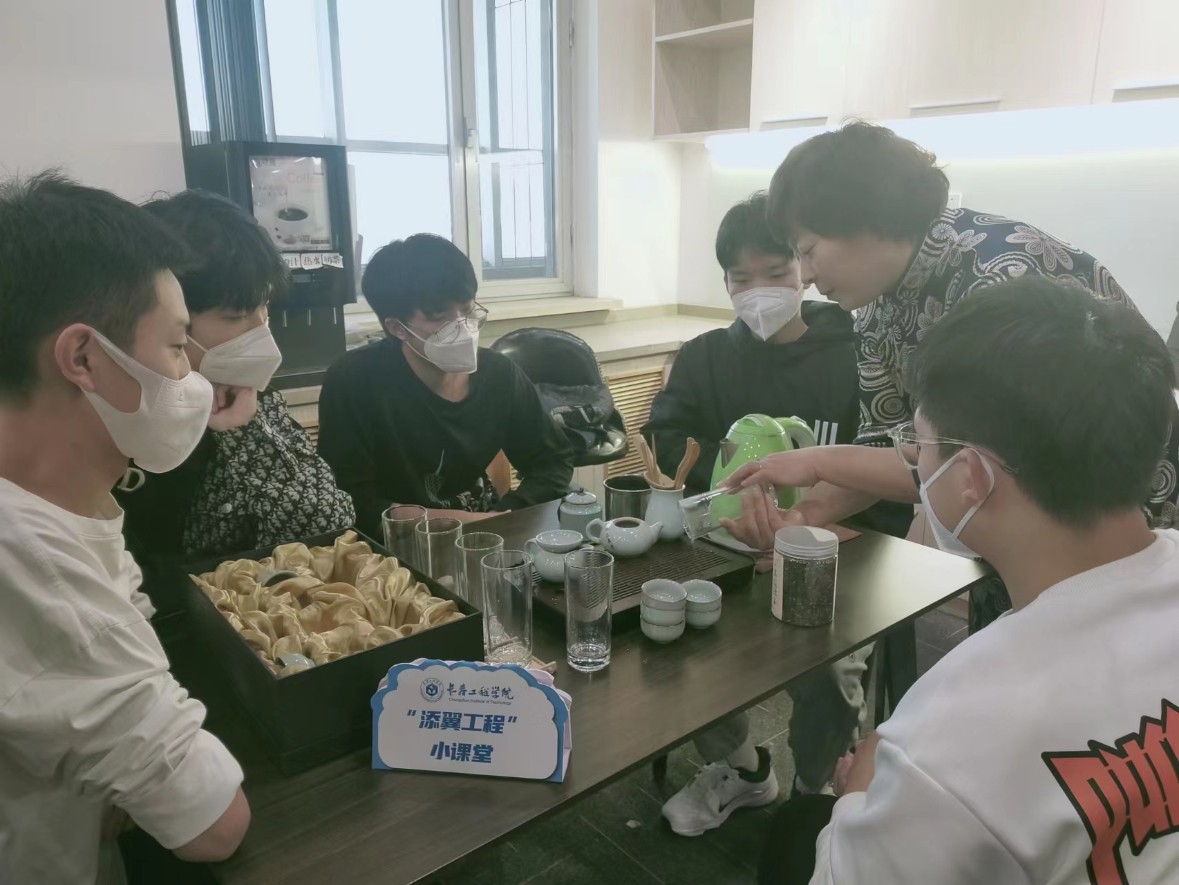 付大伟老师首先介绍了中华茶文化的悠久历史,茶的产区、类别及功效,她讲解了泡茶的步骤,并邀请两位学生进行现场展示。随后,同学们动手实践泡茶过程,品尝过后对各类茶的特色进行交流。现场茶香四溢,古筝悠扬。