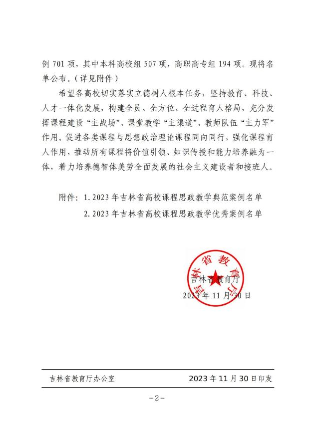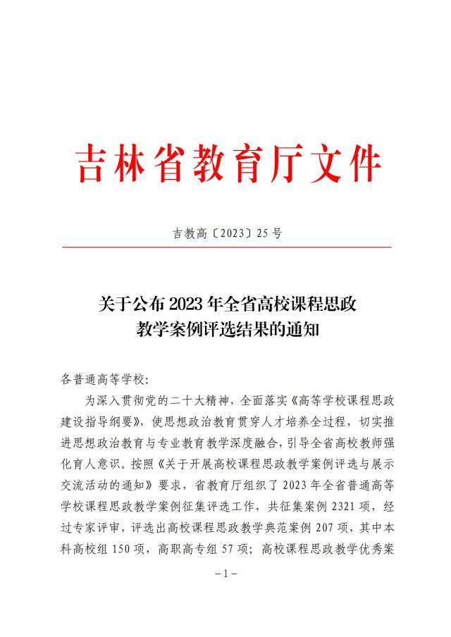 近日,吉林省教育厅印发了《关于公布2023年全省高校课程思政教学案例评选结果的通知》(吉教高〔2023〕25 号),我校4个案例入选高校课程思政教学典范案例,14个案例入选高校课程思政教学优秀案例。