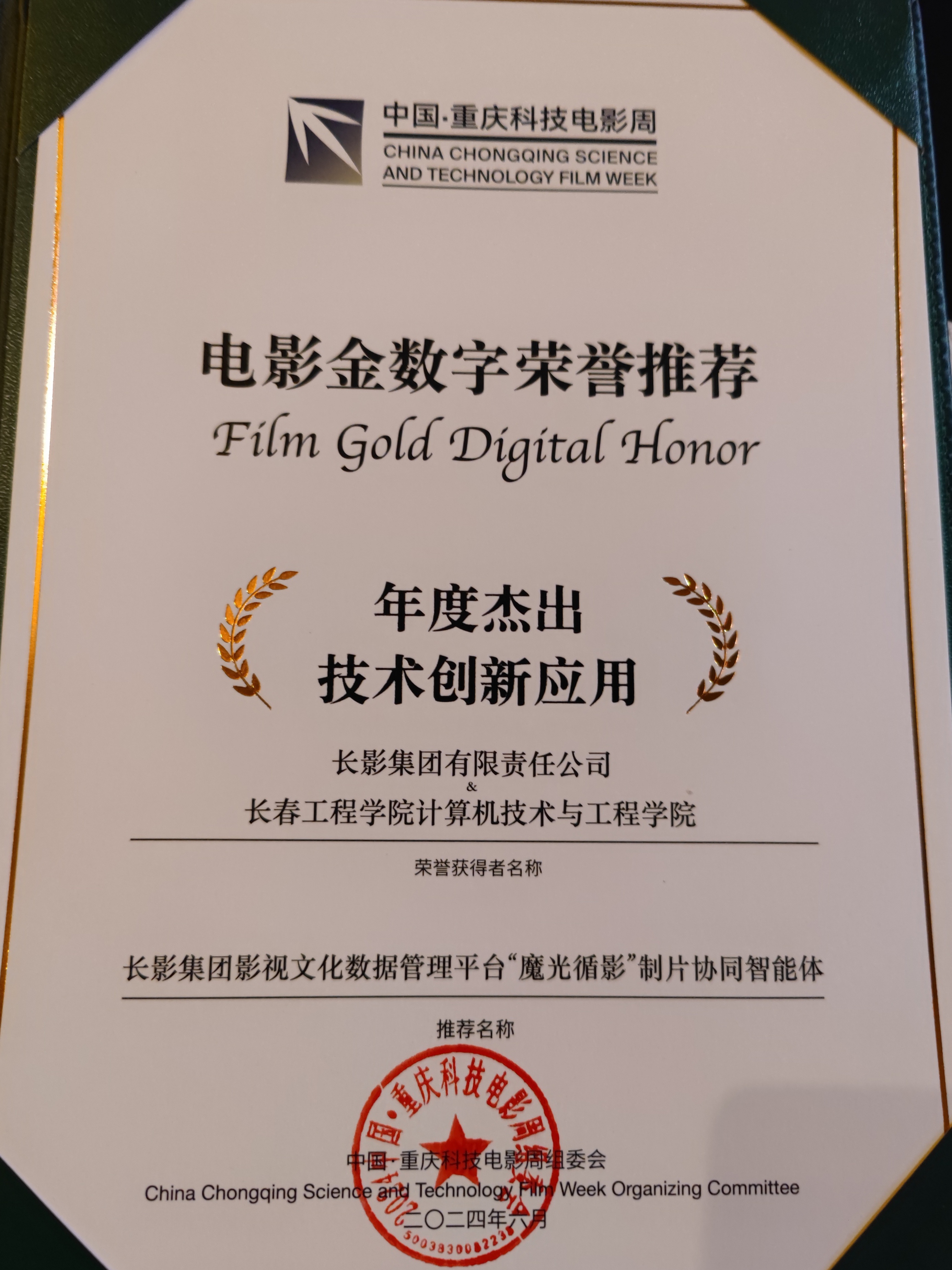 6月26日晚,首届中国·重庆科技电影周在永川国际会展中心隆重开幕。我校计算机技术与工程学院院长赵佳教授作为电影金数字荣誉推荐委员会委员,应邀出席了颁奖典礼。由我校计算机技术与工程学院与长影集团有限公司联合研发的“长影集团影视文化数据管理平台‘魔光循影’制片协同智能体”荣获年度杰出技术创新应用奖。该奖项是中国电影技术领域最高奖项。