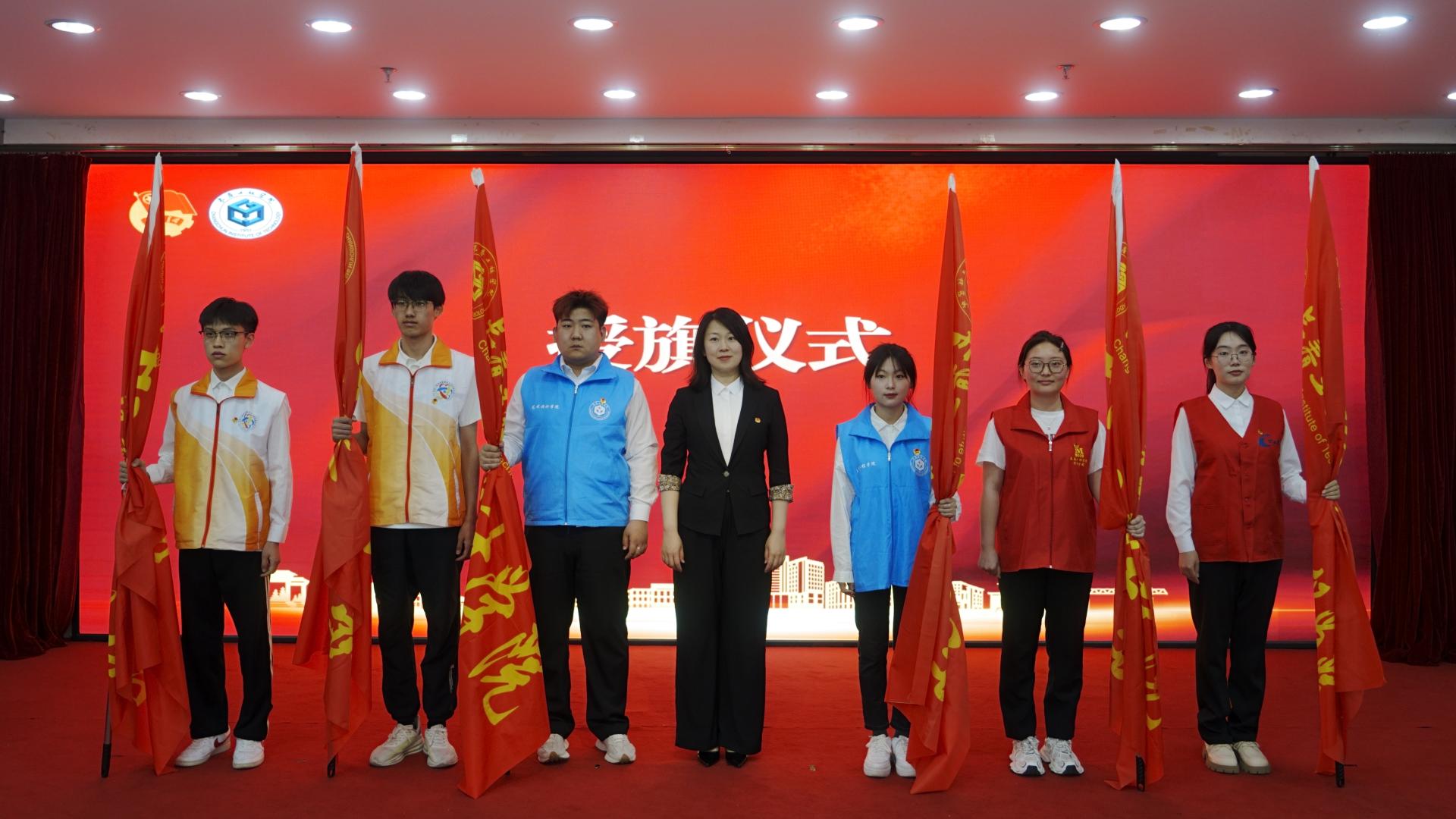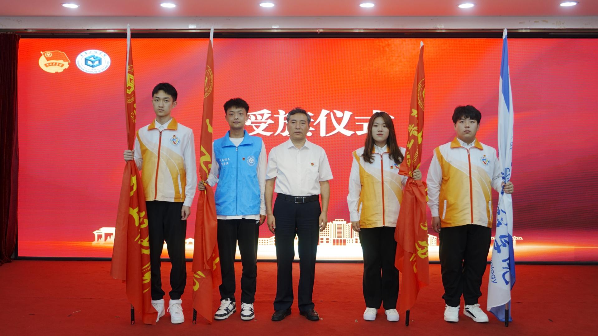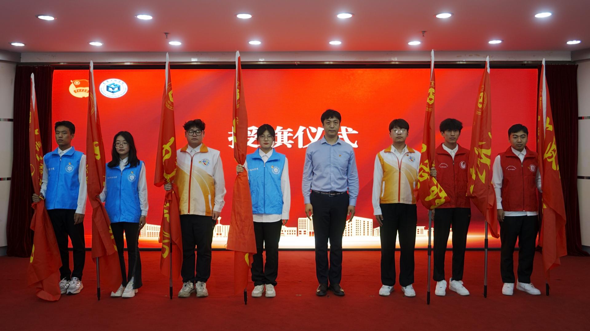 党委副书记刘兆国,校团委书记张天天、校团委教师刘寅雷为2024年暑期“三下乡”社会实践活动重点团队授旗。