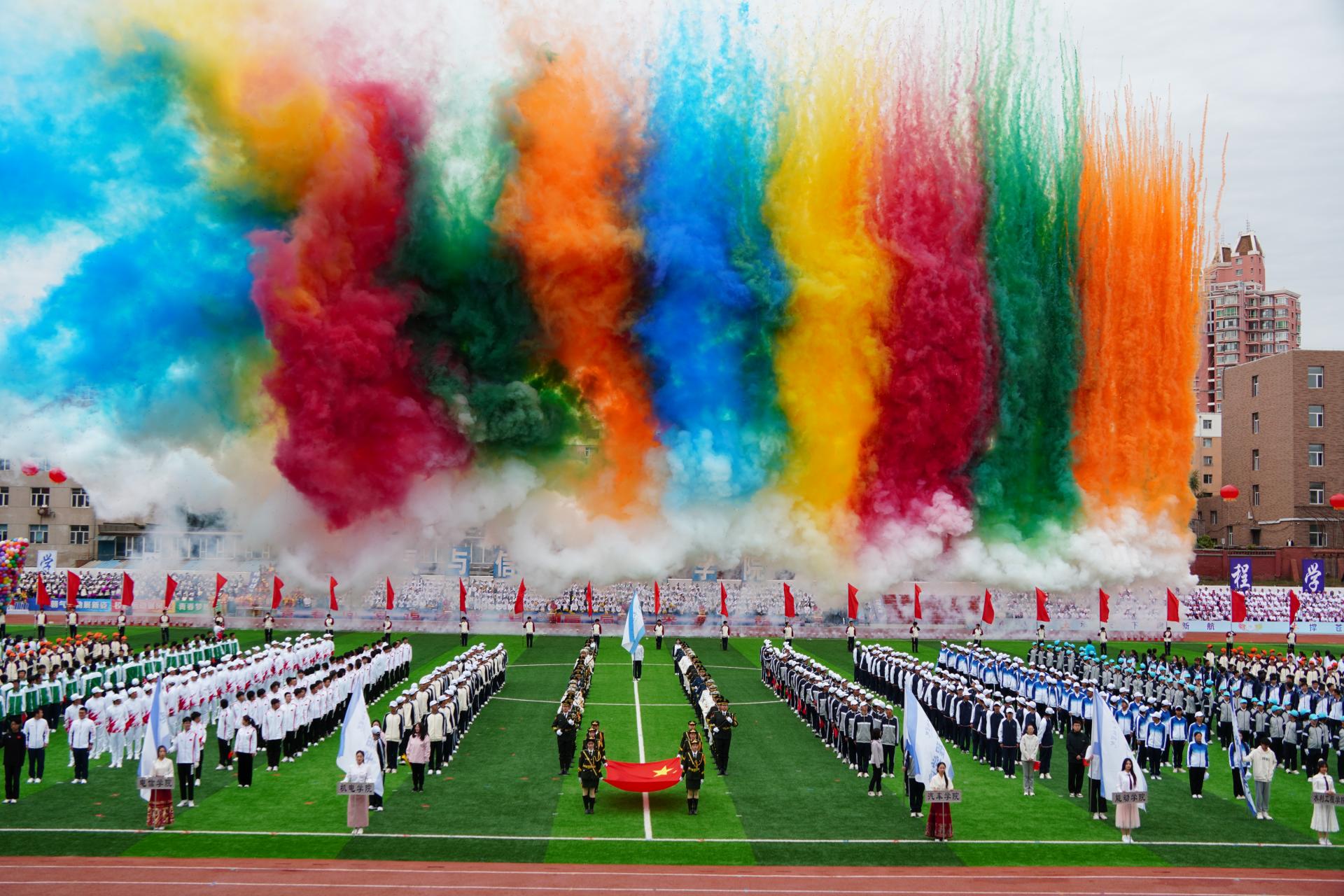 在体育教研部副主任徐振军的指挥下,同学们带来了精彩的大型团体操表演。机电工程学院、能源动力工程学院、电气与信息工程学院为大会献上了精彩节目,为运动会增添了活力,营造了热烈的氛围,赢得了现场观众的阵阵掌声。