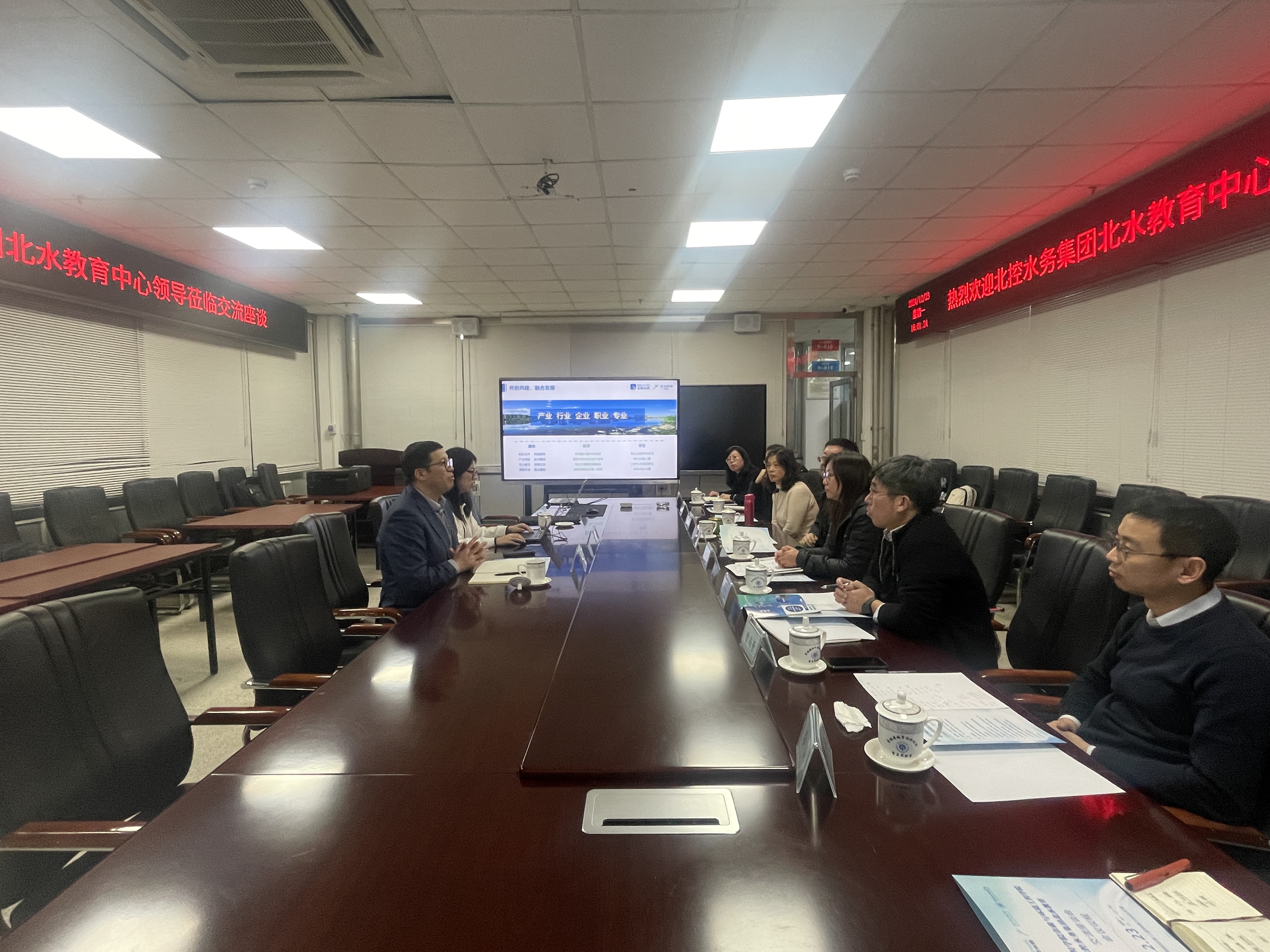 冀广鹏总经理介绍了北控水务集团的基本情况、业务范围、产业优势和发展方向,他表示,集团依托北水教育作为教育板块的实际开展平台,拉通行业企业与应用型高校,打造生态环境领域畅通产教融合创新实践的平台,他邀请学院领导老师到北控水务集团进行访企拓岗。