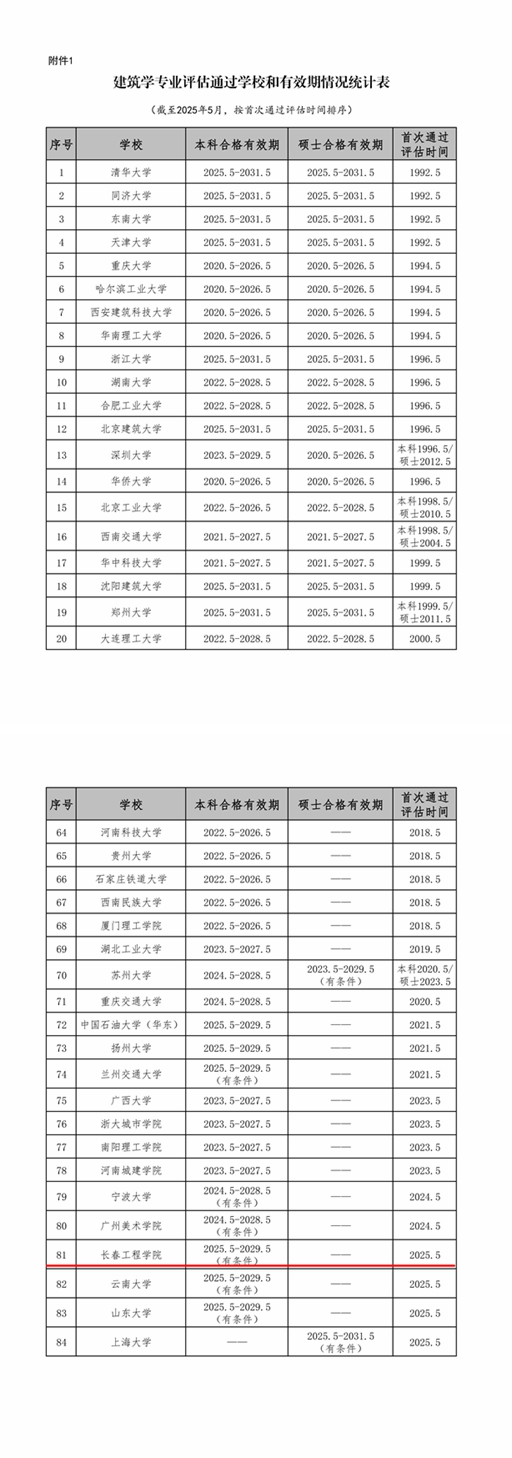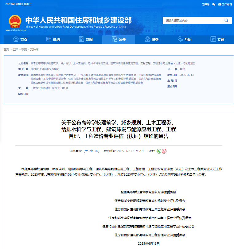 近日,住房和城乡建设部发布《关于公布高等BBV网页版建筑学、城乡规划、土木工程类、给排水科学与工程、建筑环境与能源应用工程、工程管理、工程造价专业评估(认证)结论的通告》(土建专业评估通告〔2025〕第1号),我校建筑学专业和工程造价专业通过评估(认证),合格有效期均为4年,自2025年5月起至2029年5月止。