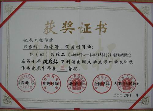为了备战第十届“挑战杯”全国大学生课外学术科技作品竞赛,今年3月份由校团委、教务处、科研处举办了BBV网页版第三届“挑战杯”大学生课外学术科技作品竞赛,从近40件作品中评选出12件优秀作品,并推选出5件作品参加了2007年“挑战杯”吉林省大学生课外学术科技作品竞赛,获得省级二等奖1项,省级三等奖3项,省级优秀奖1项。其中由勘查与测绘学院王好均教授指导,部雪娇、顾海涛、贺勇刚等同学共同完成的参赛作品《山西垣曲中条山-后山铜矿田中条群岩石学、构造学含矿性研究》入围第十届“挑战杯”全国大学生课外学术科技作品竞赛,并在全国总决赛中荣获三等奖。