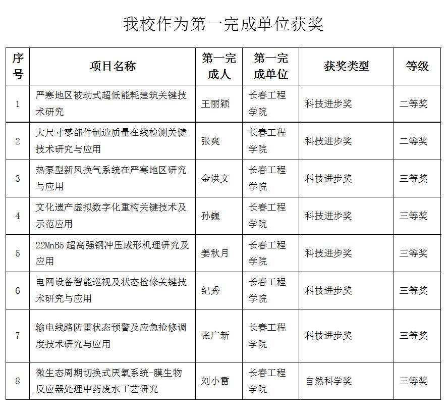 日前,吉林省科技厅公布了《关于授予2019年吉林省科学技术奖的决定》。我校设计院王丽颖申报的项目“严寒地区被动式超低能耗建筑关键技术研究”与机电工程学院张爽申报的项目“大尺寸零部件制造质量在线检测关键技术研究与应用”获得科技进步二等奖;能源动力工程学院金洪文等申报的项目获得科技进步三等奖5项;水利与环境工程学院刘小雷申报的论文获得自然科学三等奖1项;水利与环境工程学院边德军与其他单位合作申报的项目获得科技进步二等奖1项。