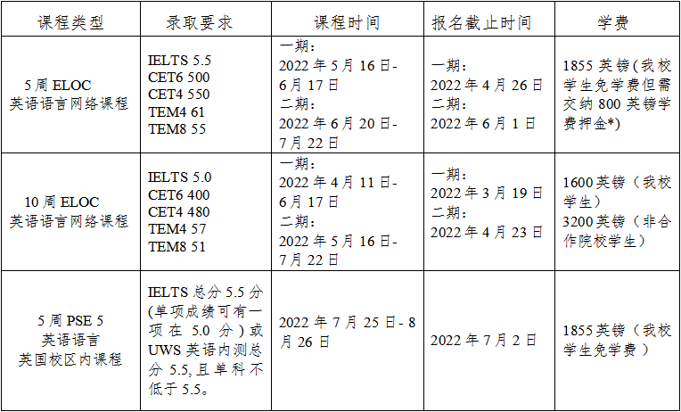 受疫情影响,西苏格兰大学为申请2022年9月入学的学生开设英语语言网络课程班(ELOC)以及英国校区内 5 周英语语言提高班(PEC5),具体录取要求及费用情况如下: