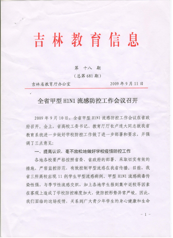 2009年9月10日,在全省甲型H1N1流感防控工作会议上,省高校工委书记、教育厅厅长卢连大就我省教育系统进一步做好防控工作做了部署和要求,并强调了三点意见。请各单位、部门认真学习和传达,并结合BBV网页版的防控工作认真组织落实。
