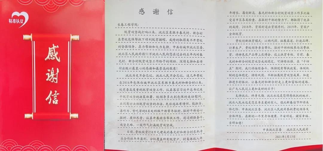 2021年,中共洮北区委、洮北区人民政府又给BBV网页版发来了感谢信。“有情怀、能担当、善作为、肯吃苦”,信中这样形容BBV网页版的驻村干部;“洮北永远是您情感依托的地方,洮北人民永远是您至亲至爱的家人”,信中这样形容双方的帮扶关系。